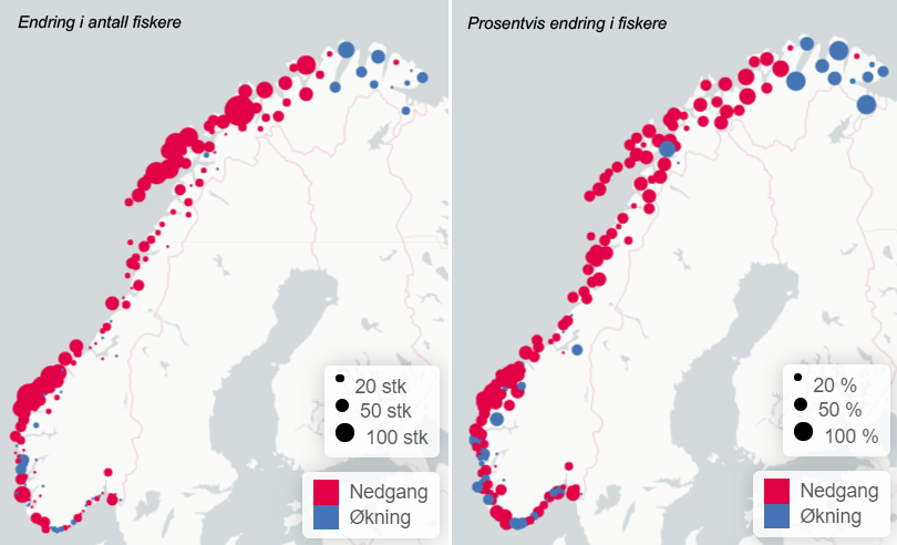 Figur 50 viser at det har vært en nedgang i antall registrerte fiskere i flertallet av kommunene med registrerte fiskere i perioden 2004 til 2018. Endring i antall registrerte heltidsfiskere i en kommune vises som en rød sirkel, mens en økning vises som en blå sirkel. Størrelsen på sirkelen viser størrelsen på endringen i antall (venstre) eller i prosent (høyre). Blant de 137 kommunene som hadde minst 10 fiskere i 2004 og 2018, hadde bare 25 kommuner en økning i antall fiskere.